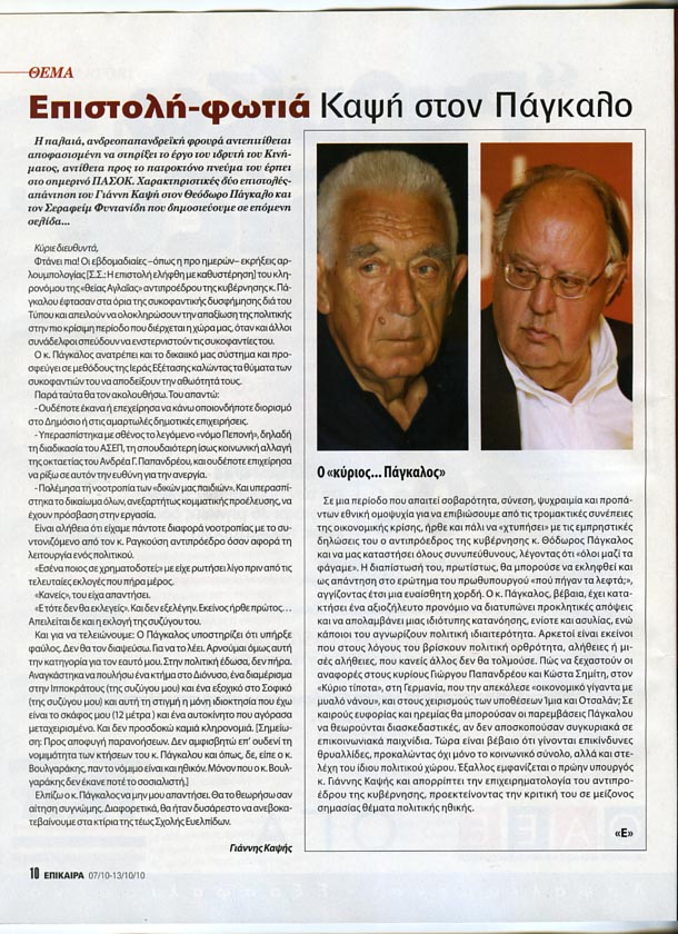 Στα τελευταία επίκαιρα ο γιάννης καψής ευθέως κατηγορεί τον πάγκαλο ως αχυράνθρωπο ισχυρού παράγοντα περιγράφοντας ένα προεκλογικό μεταξύ τους διάλογο. Προκαλεί μάλιστα το χοντρό να μην αποτολμήσει να του κάνει μήνυση και να σιωπήσει για το καλό όλων. Οντως ο κύριος αντιπρόεδρος της κυβέρνησης έχει μείνει άφωνος και έχει κανει γαργάρα την πρόκληση.
